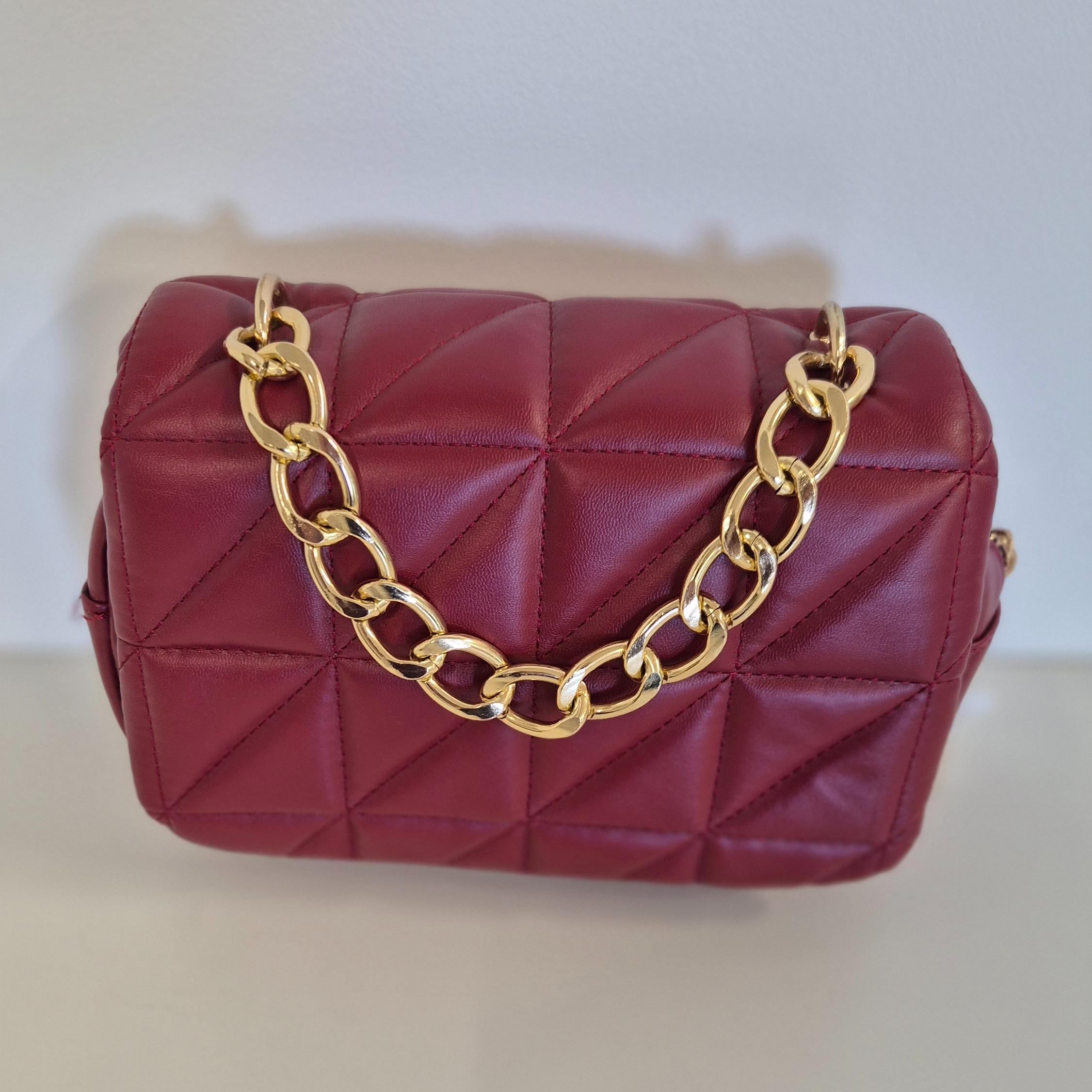 Greta nasce per chi desidera una borsa piccola ma di forte impatto. La trapuntatura geometrica valorizza la morbidezza dell’ecopelle, mentre la catena dorata aggiunge un tocco luminoso e chic. Il bordeaux, elegante e deciso, la rende l’accessorio perfetto per completare sia look casual che outfit più ricercati.