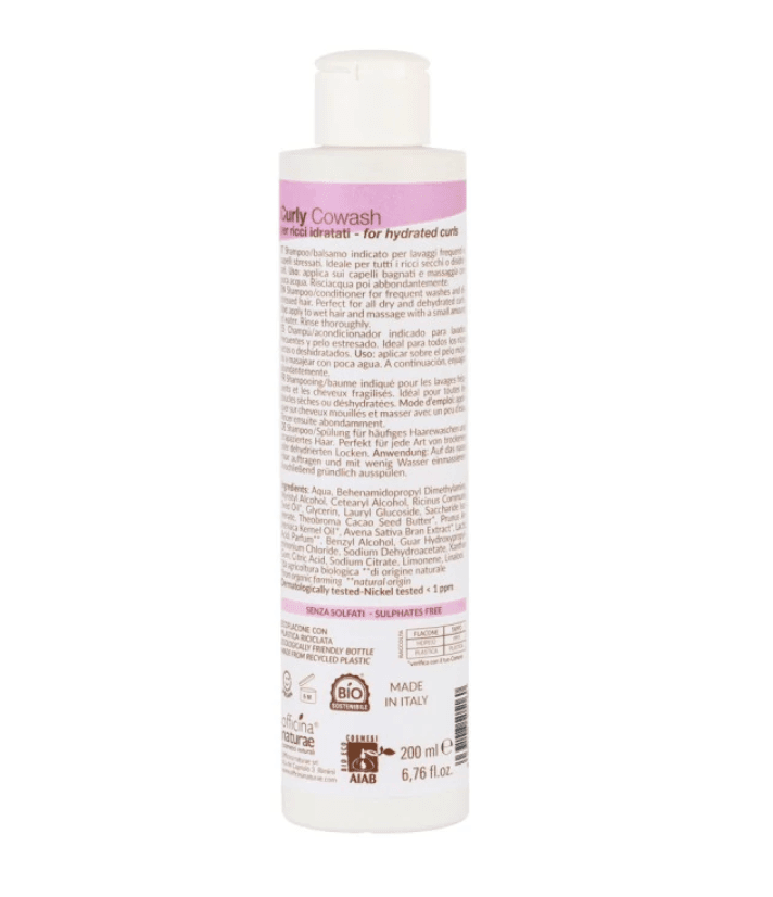 Il Curly Cowash è certificato AIAB, garantendo ingredienti biologici e naturali di alta qualità. Inoltre, il flacone da 200 ml è fatto con plastica riciclata post consumo, testata per il contatto con alimenti, quindi sicura anche per i cosmetici.