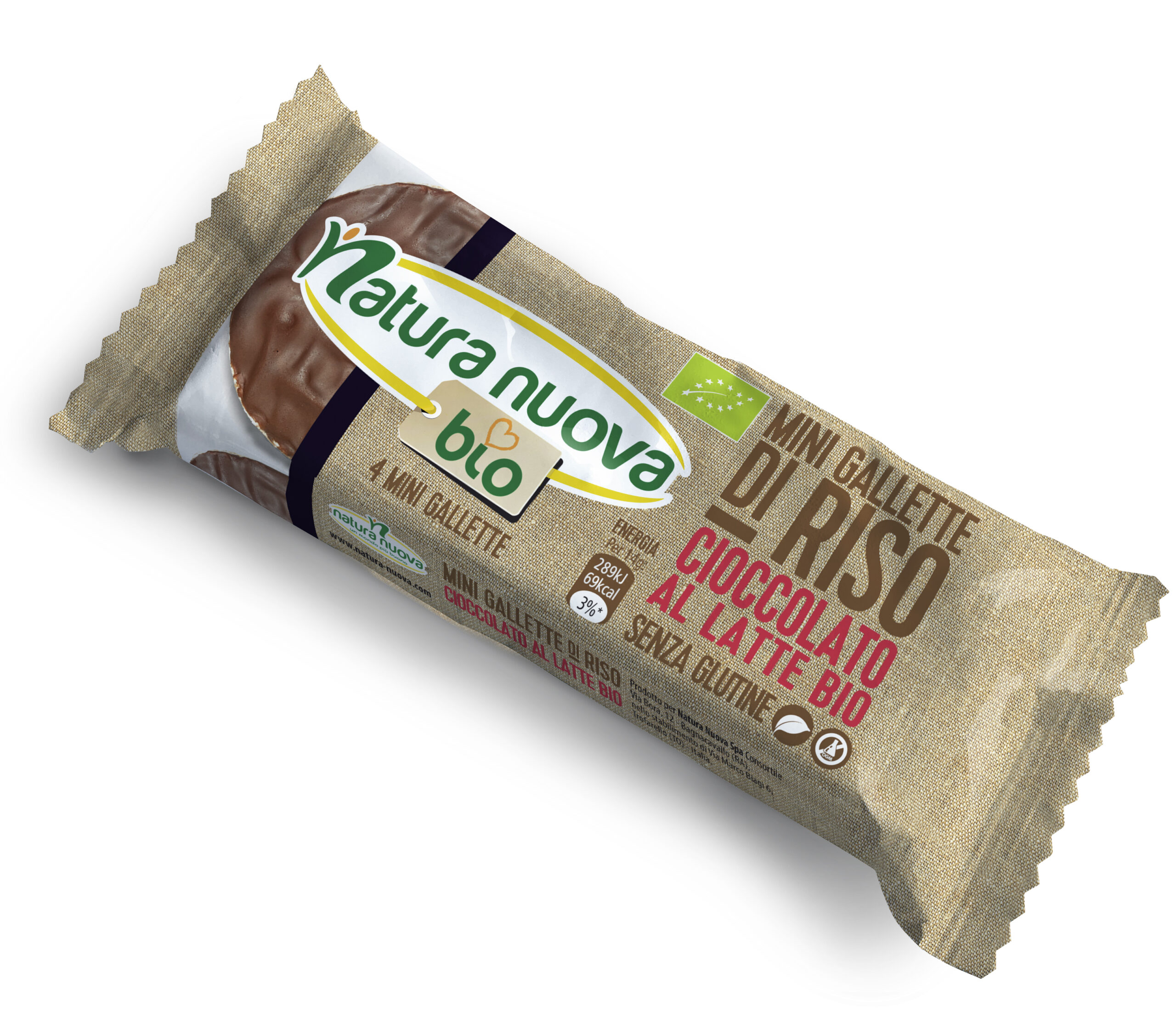 Quattro mini gallette di riso bio ricoperte con uno strato di cioccolato al latte. Per una pausa leggera e golosa.