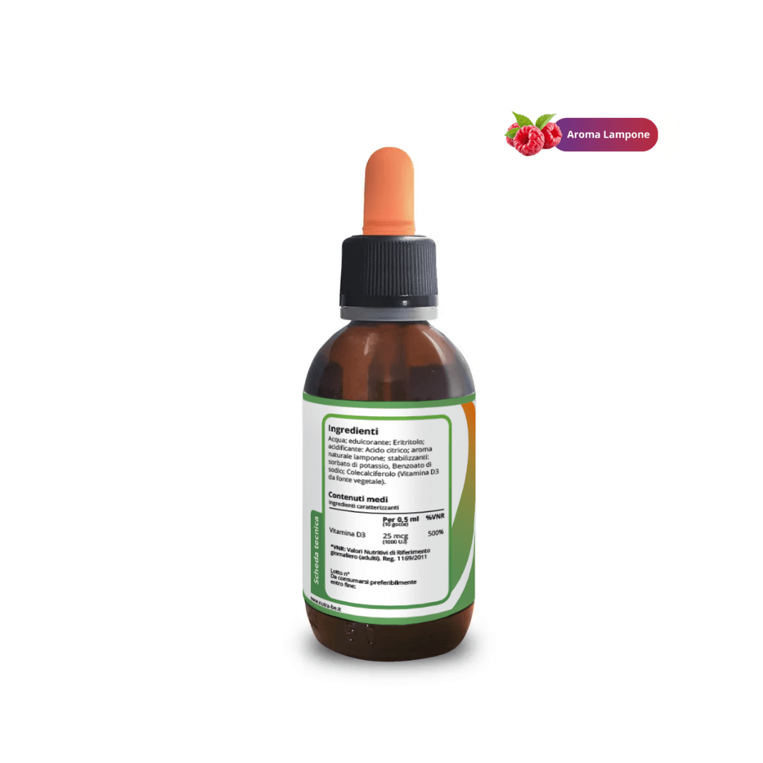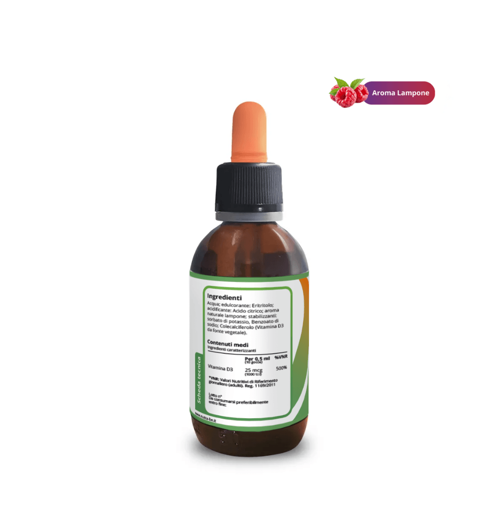 acqua; edulcorante: eritritolo; acidificante: acido citrico; aroma naturale Lampone; stabilizzanti: sorbato di potassio, benzoato di sodio; Colecalciferolo (vitamina D3 da fonte vegetale).