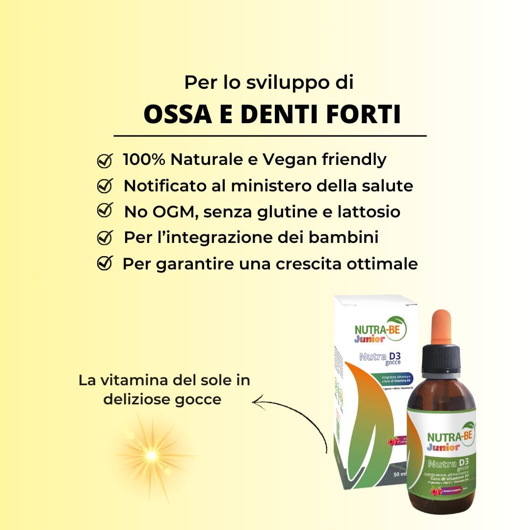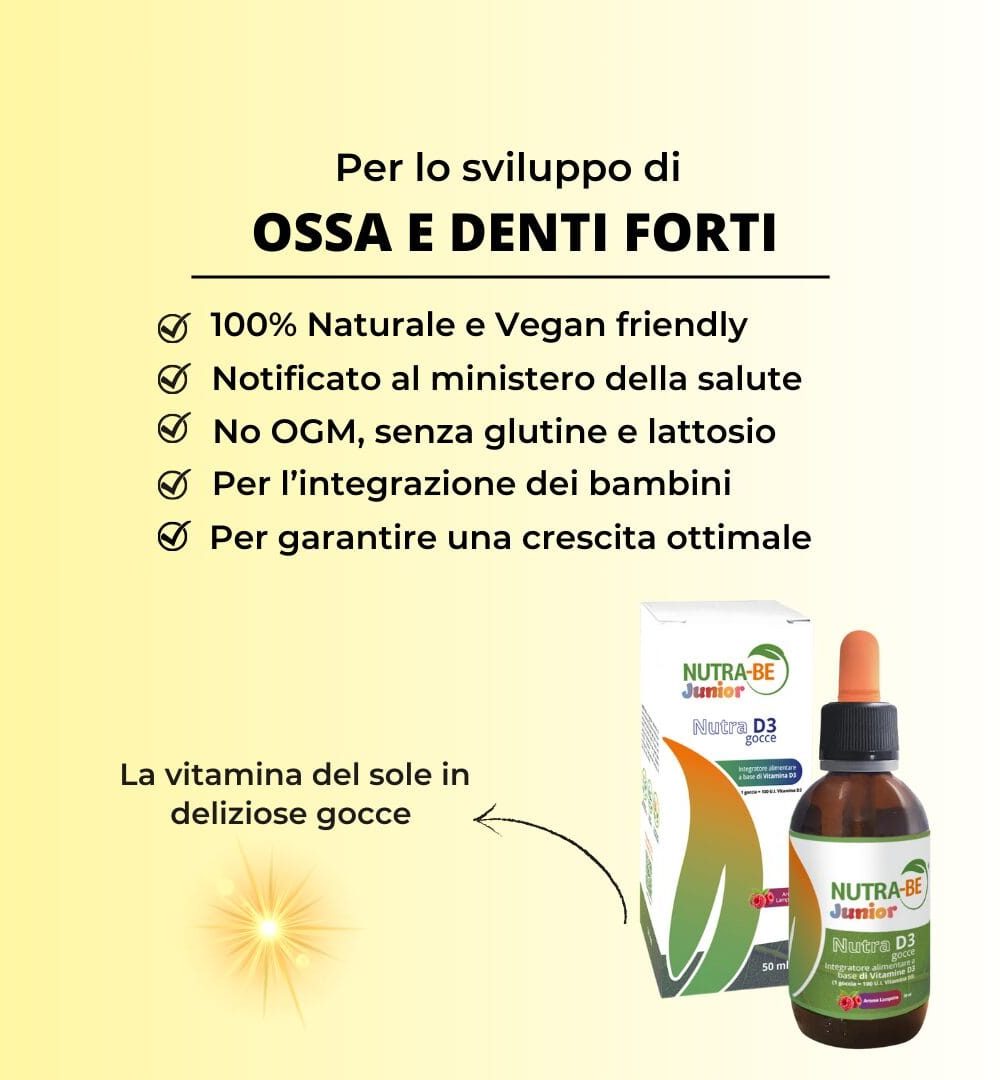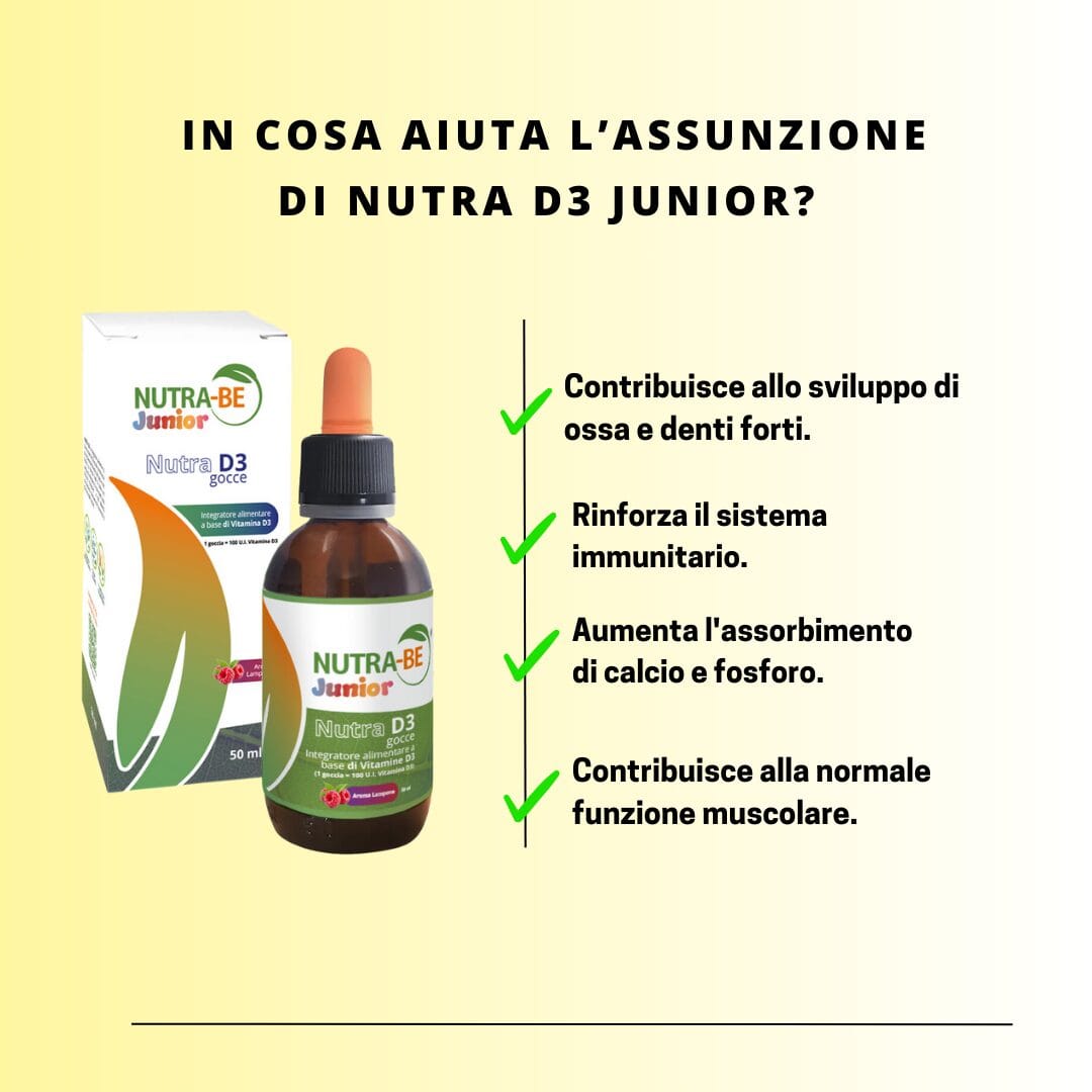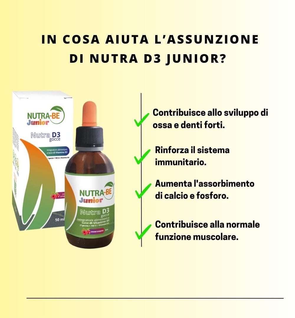 NUTRA D3 JUNIOR 50ml è un integratore alimentare a base di vitamina D3 la quale contribuisce al normale assorbimento del calcio e del fosforo, ai normali livelli di calcio nel sangue, al benessere di ossa e denti, alla funzione muscolare e del sistema immunitario e interviene nel processo di divisione delle cellule.