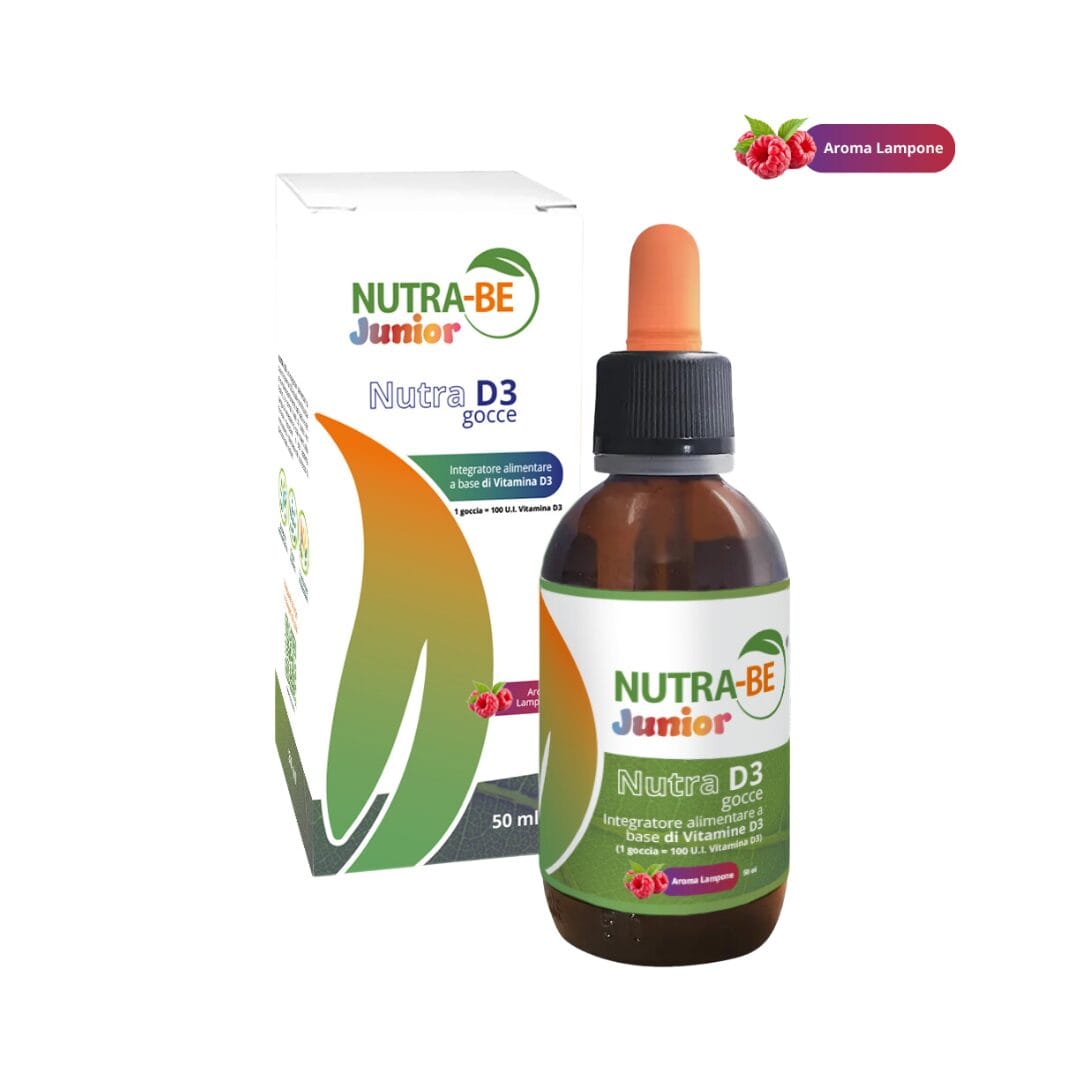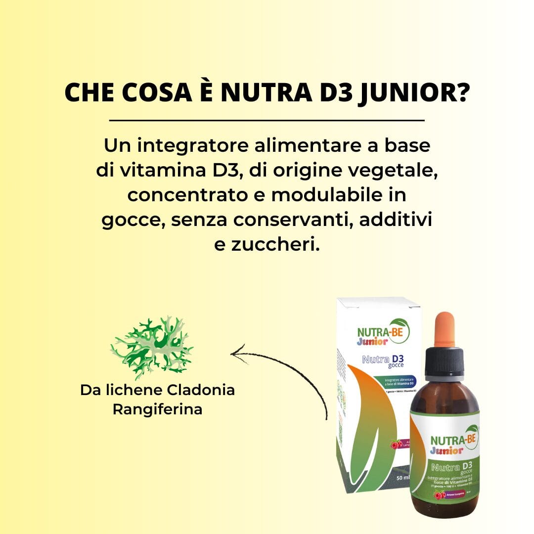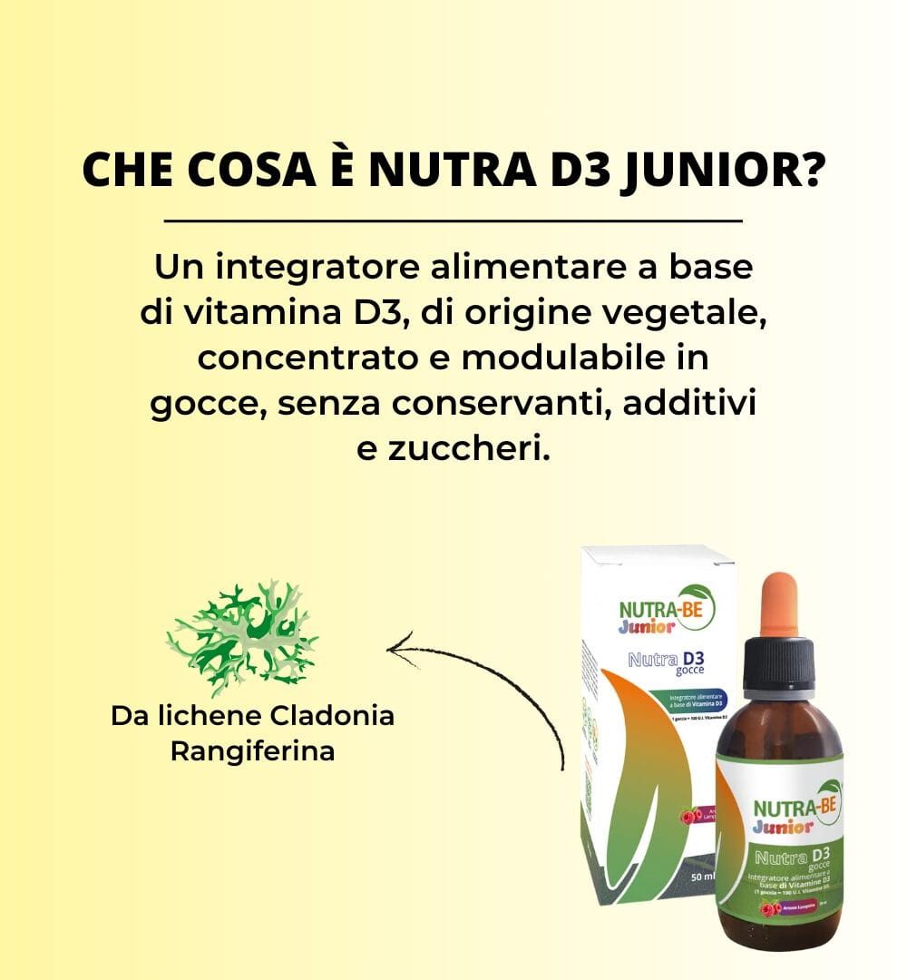 NUTRA D3 JUNIOR 50ml è un integratore alimentare a base di vitamina D3 la quale contribuisce al normale assorbimento del calcio e del fosforo, ai normali livelli di calcio nel sangue, al benessere di ossa e denti, alla funzione muscolare e del sistema immunitario e interviene nel processo di divisione delle cellule.