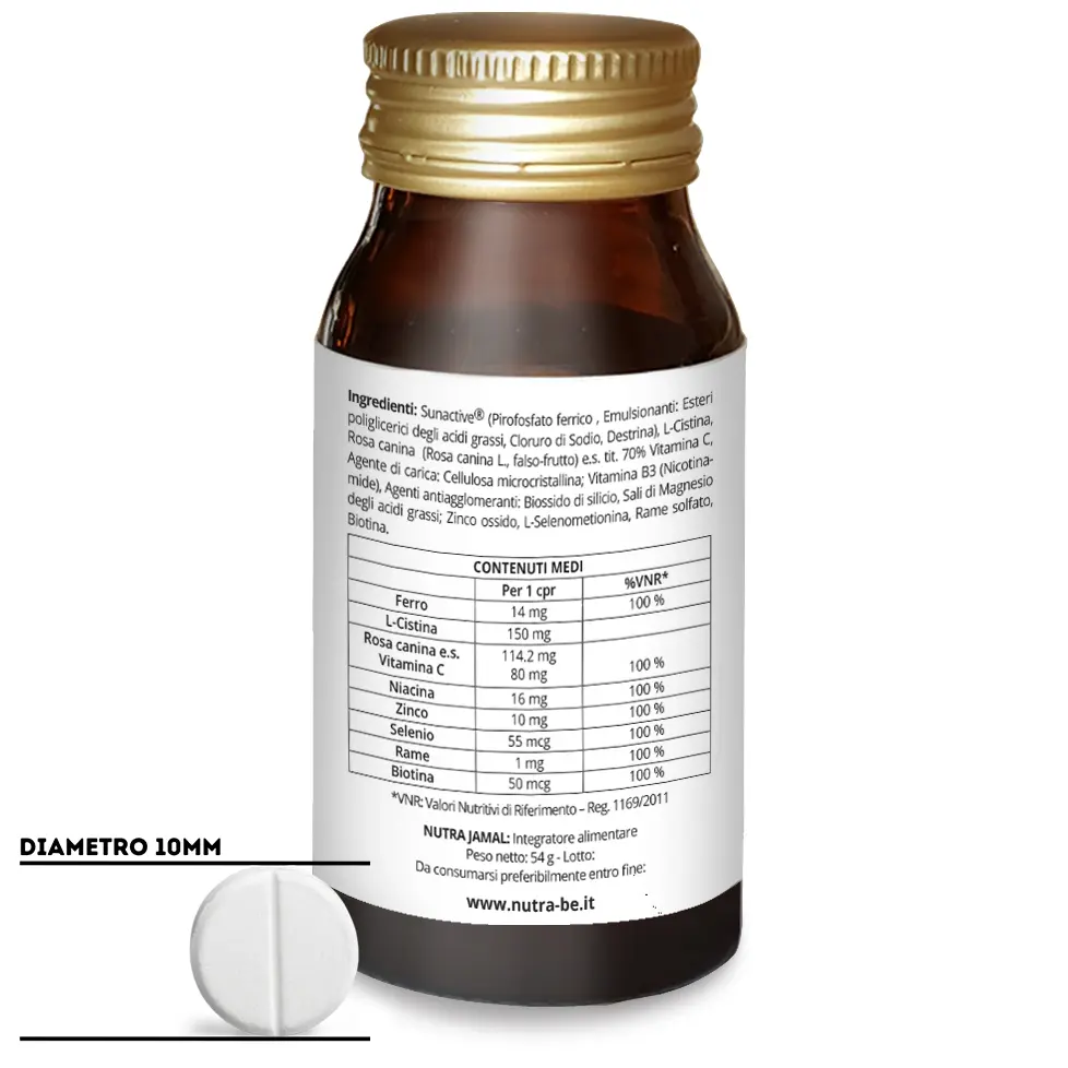 NUTRA JAMAL è un integratore alimentare per adulti a base di Cistina, Rosa canina, Ferro, Rame, Zinco, Selenio, Niacina e Biotina.