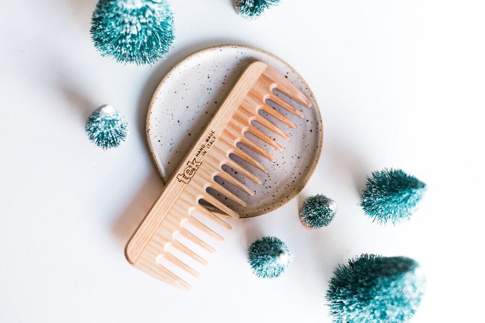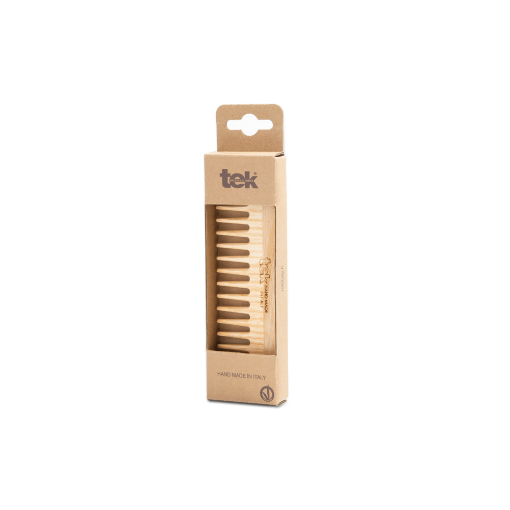 Pettine piccolo a denti radi realizzato in legno di frassino certificato 100% FSC®. Rifinito, levigato a mano e trattato con olio di lino e cera vegetale di carnauba.