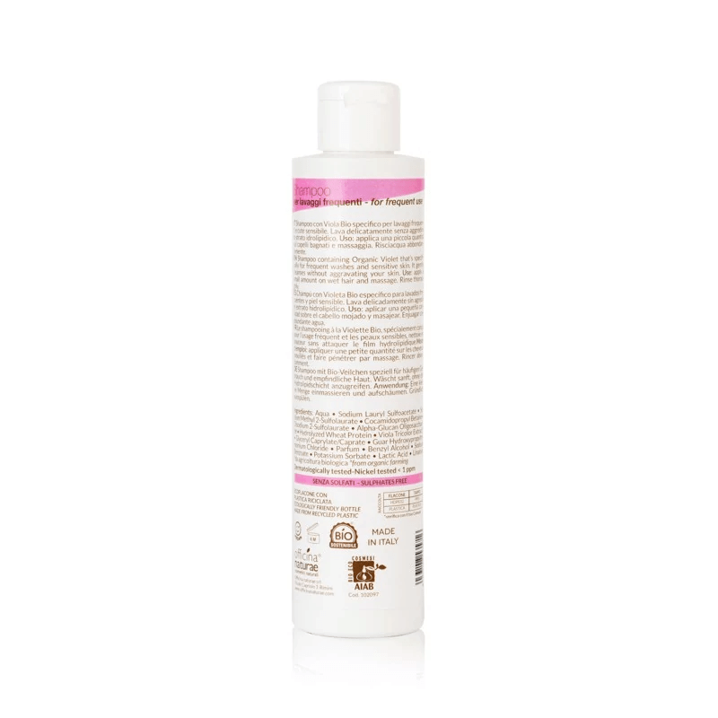 Per questo nello shampoo naturale lavaggi frequenti, sono state utilizzate basi lavanti fra le più delicate e ingredienti come l’estratto di Viola bio e le proteine del Grano, che favoriscono l’idratazione di cute e capelli, mantenendo in buona salute la tua chioma, anche se la lavi tutti i giorni perché sei sempre in giro, fai palestra o fai un lavoro in cui è necessaria la massima igiene. Oltre alla cute, rispetta anche la natura, con il suo flacone in plastica riciclata post consumo, buona per te e per il Pianeta! Infine il suo delicato profumo con sentori agrumati, lo rende adatto per ogni esigenza olfattiva!